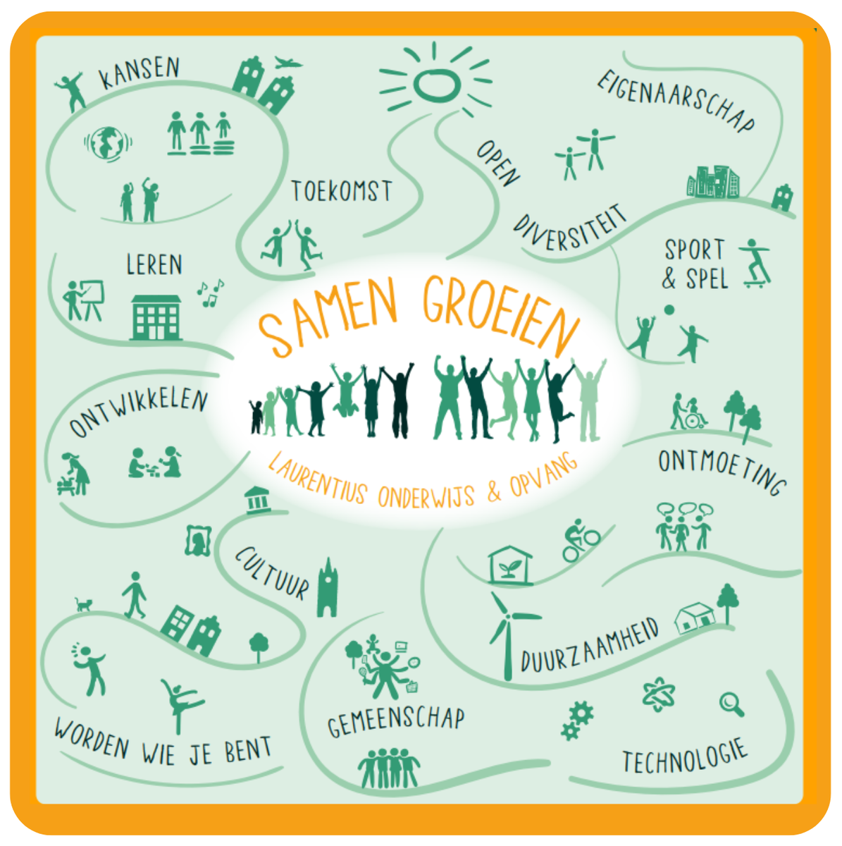 Leren is ons kernbegrip en dat doen wij, de mensen die werken bij de Laurentius, zelf ook. Net zo goed gaan wij uit van onze groeikracht. Samenwerken en samenzijn geven ons daarin plezier. Wij kijken graag bij elkaar in de keuken, precies zoals we dat graag zien bij onze leerlingen. We willen doorgroeien en onze mogelijkheden benutten. Die ruimte en dat vertrouwen hebben wij en onze kinderen bij de Laurentius.